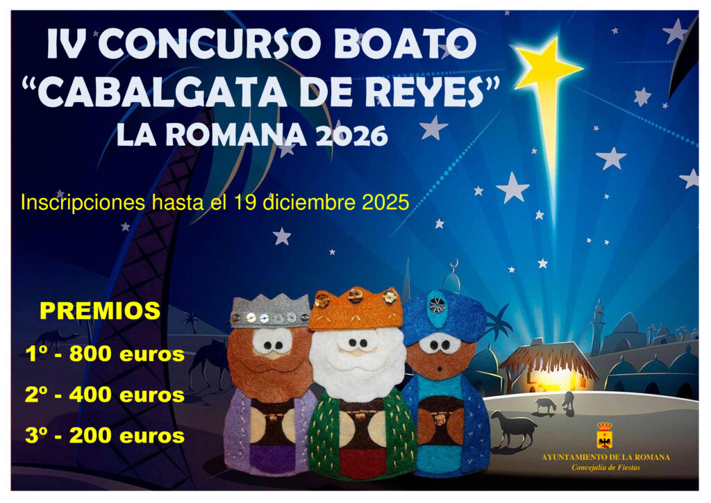 La Concejalía de Fiestas del Ayuntamiento de La Romana, con el propósito de fomentar la participación ciudadana en la Cabalgata de Reyes 2026, las tradiciones populares y la ilusión de los más pequeños de nuestro municipio, convoca el “IV CONCURSO DE BOATO DE CABALGATA DE REYES 2026”.