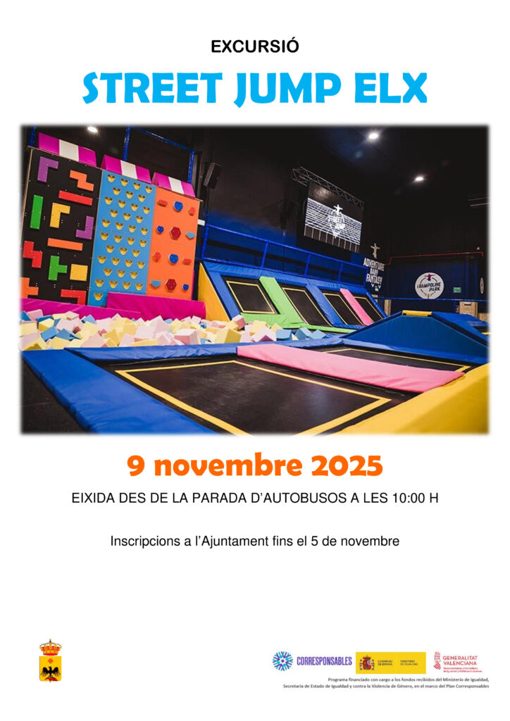 Diumenge que ve 9 de novembre, un grup de 60 xiquets, jóvens i adolescents, acompanyats dels respectius monitors realitzaran un excursió a la veïna ciutat d’Elx per a visitar i gaudir un matí del STREET JUMP. Els participants han hagut de realitzar una inscripció prèvia, ja que les places estaven limitades a les de l’autobús que llevarà a cap el transport.