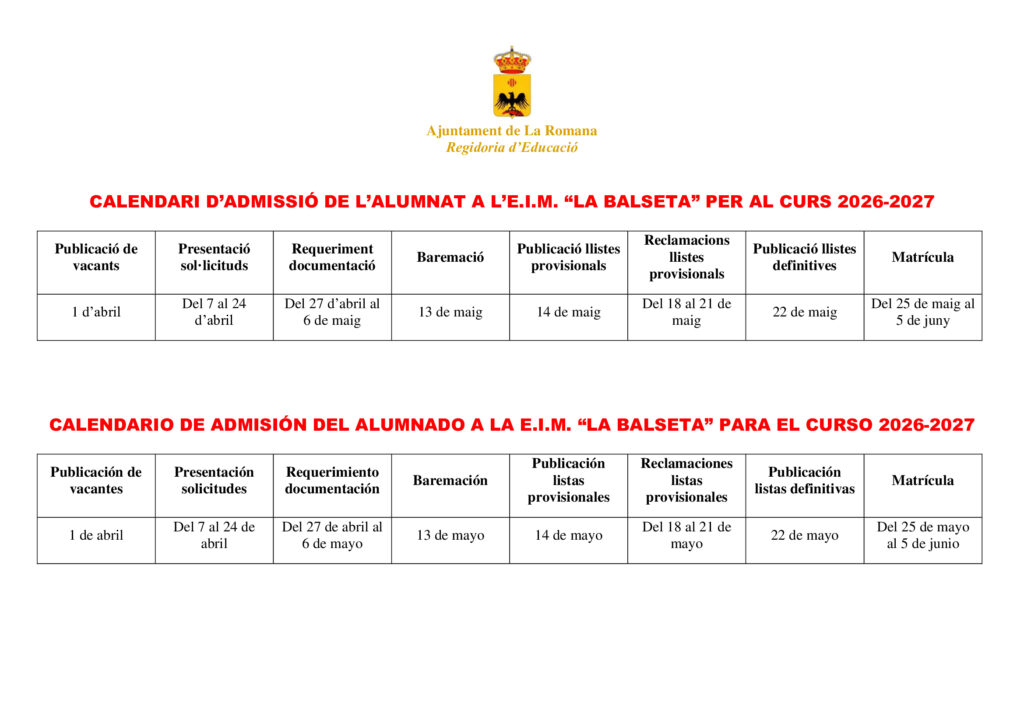 El passat 9 de març, per resolució d’Alcaldia 145/2026, s’aprovava el calendari i els criteris pels quals es regirà el procés d’admissió d’alumnes a l’Escola Infantil municipal “La Balseta” per al curs 2026-2027.
