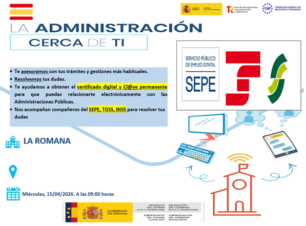 La Subdelegació del Govern a Alacant, a través de la Regidoria de Participació Ciutadana de l’Ajuntament de La Romana, organitza una sessió informativa per a tota la ciutadania amb l’objectiu d’acostar l’Administració als ciutadans. Esta sessió es durà a terme el dimecres 15 d’abril a partir de les 9.00 hores a la Casa de la Joventut.